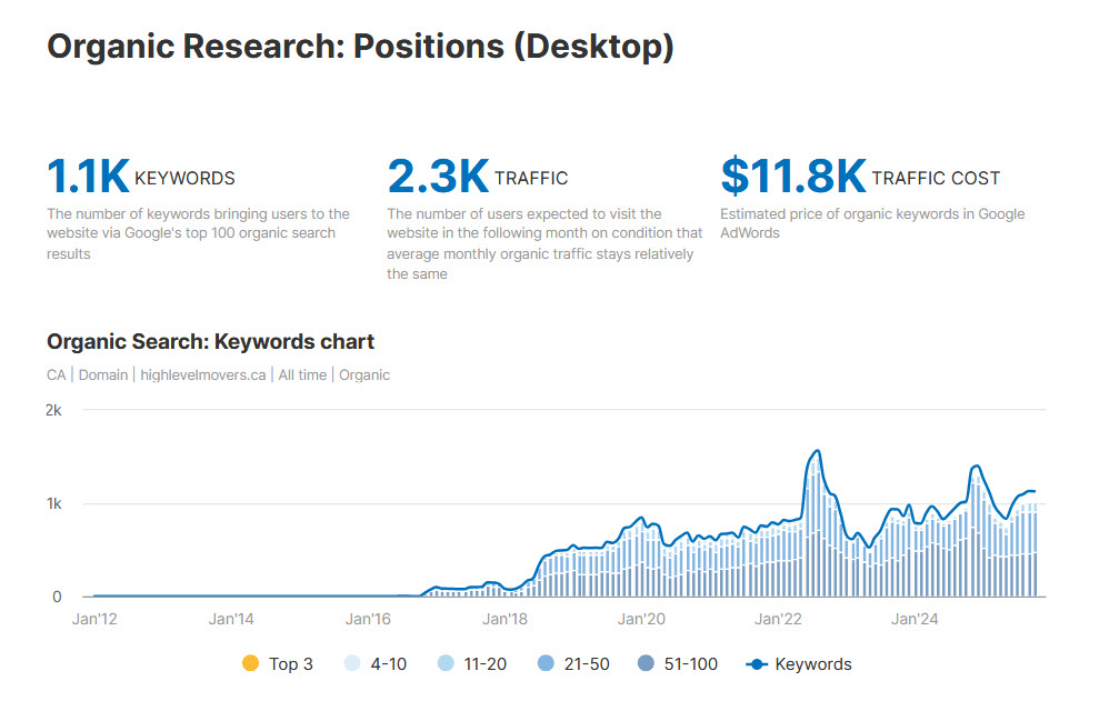 Summary: In a highly competitive market, the 2022 SEO program pushed High Level Movers to the #1 spot for “movers Toronto,” expanded keyword coverage, and converted more organic traffic into booked moves.